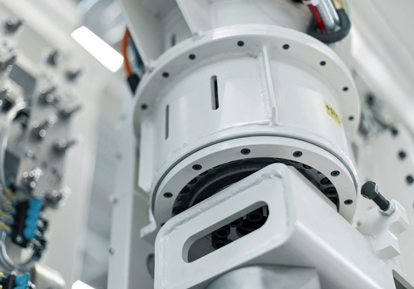 安定して優れた位置決め精度を達成できることが、HEKUMAの射出成形機の旋回アームには決定的な要因でした。Galaxie® Dは、高いねじれ剛性と、1分未満という回転方向バックラッシュによってこの性能要件を満たしています。分離式のスラスト歯の運動力学によって、1枚1枚の歯がトルク伝達時でもほぼすべて同時に噛み合うようになり、それも剛性に寄与します。さらに、個々の歯の歯面とリングギヤは対数らせん型に設計されています。そのため、動力は複数の歯によって面接触で伝達され、接触面比率が大幅に高くなります。
